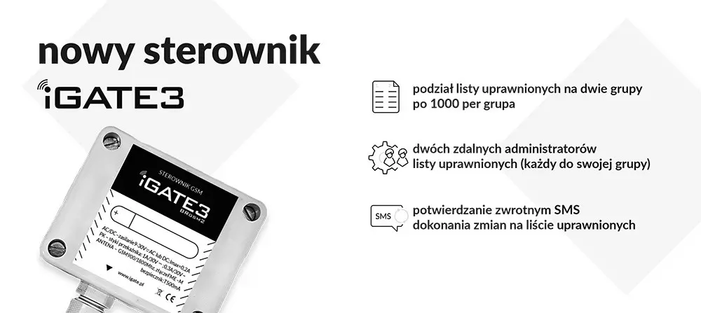 Zarządzanie listą uprawnionych numerów do sterowania jest dostępne w sposób zdalny za pomocą bezpłatnej aplikacji iGATE SMART lub prostych komend SMS, wysyłanych z telefonu uprawnionych administratorów (maks. 3 osoby). Zatem osoba zarządzająca może natychmiast, z dowolnego miejsca i samodzielnie bez udziału instalatora, dodać/usunąć numery użytkowników. Pomyślne wykonanie polecenia jest potwierdzane przez iGATE zwrotną wiadomością tekstową SMS.